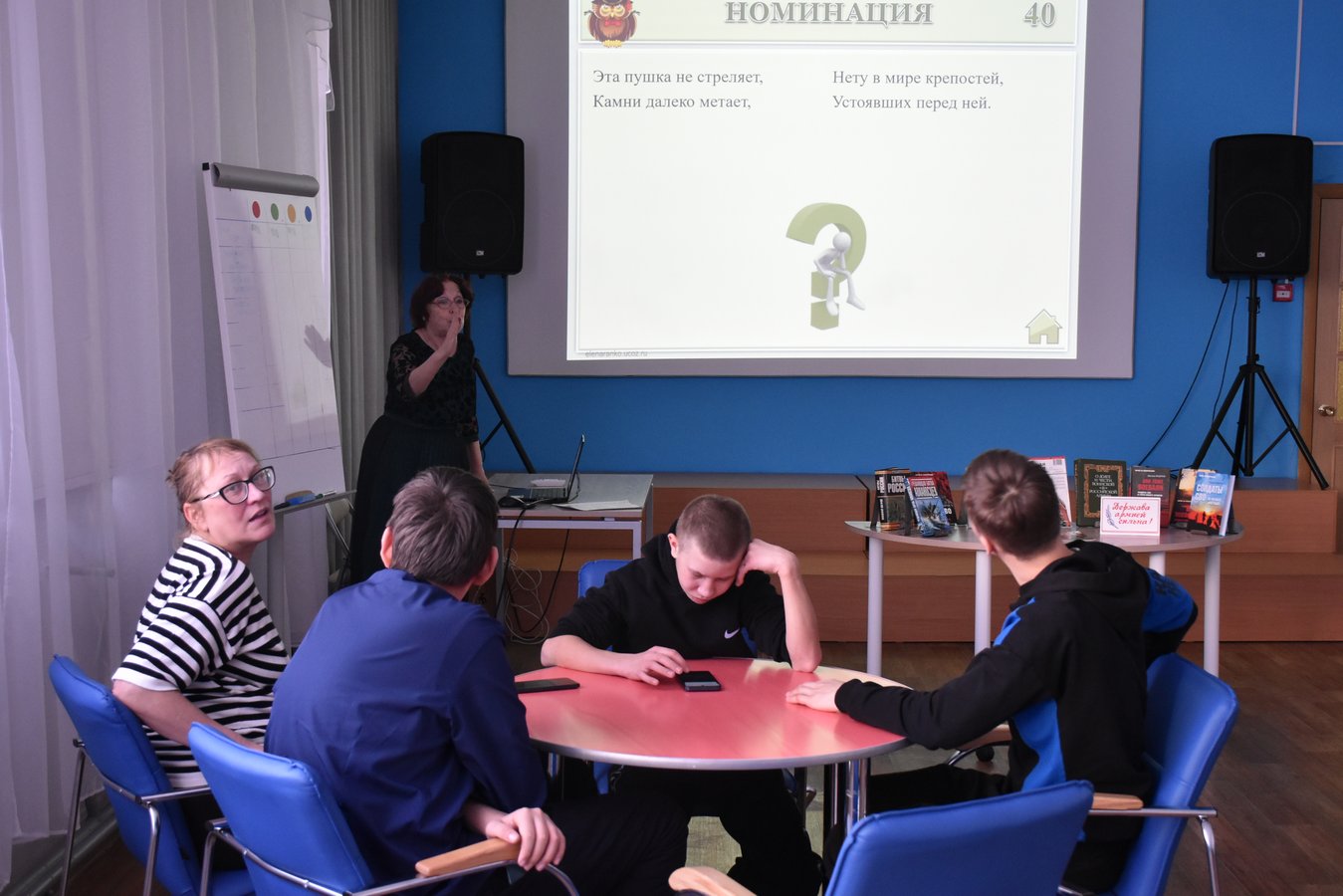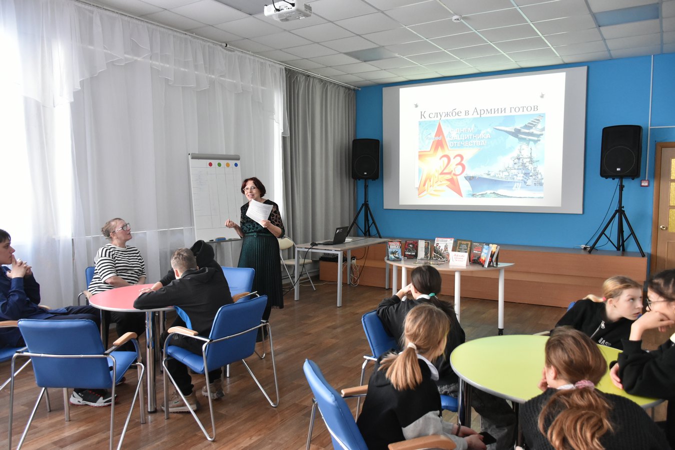 Затем школьники разбились на три команды и началась интерактивная электронная игра «К службе в Армии готов!». Ребятам предложили четыре категории вопросов: «военные профессии»; «военная техника»; «виды спорта»; «спортивное снаряжение». Играли весело, азартно, легко. В завершении игры прослушали патриотическую песню «От героев былых времён» из кинофильма «Офицеры».