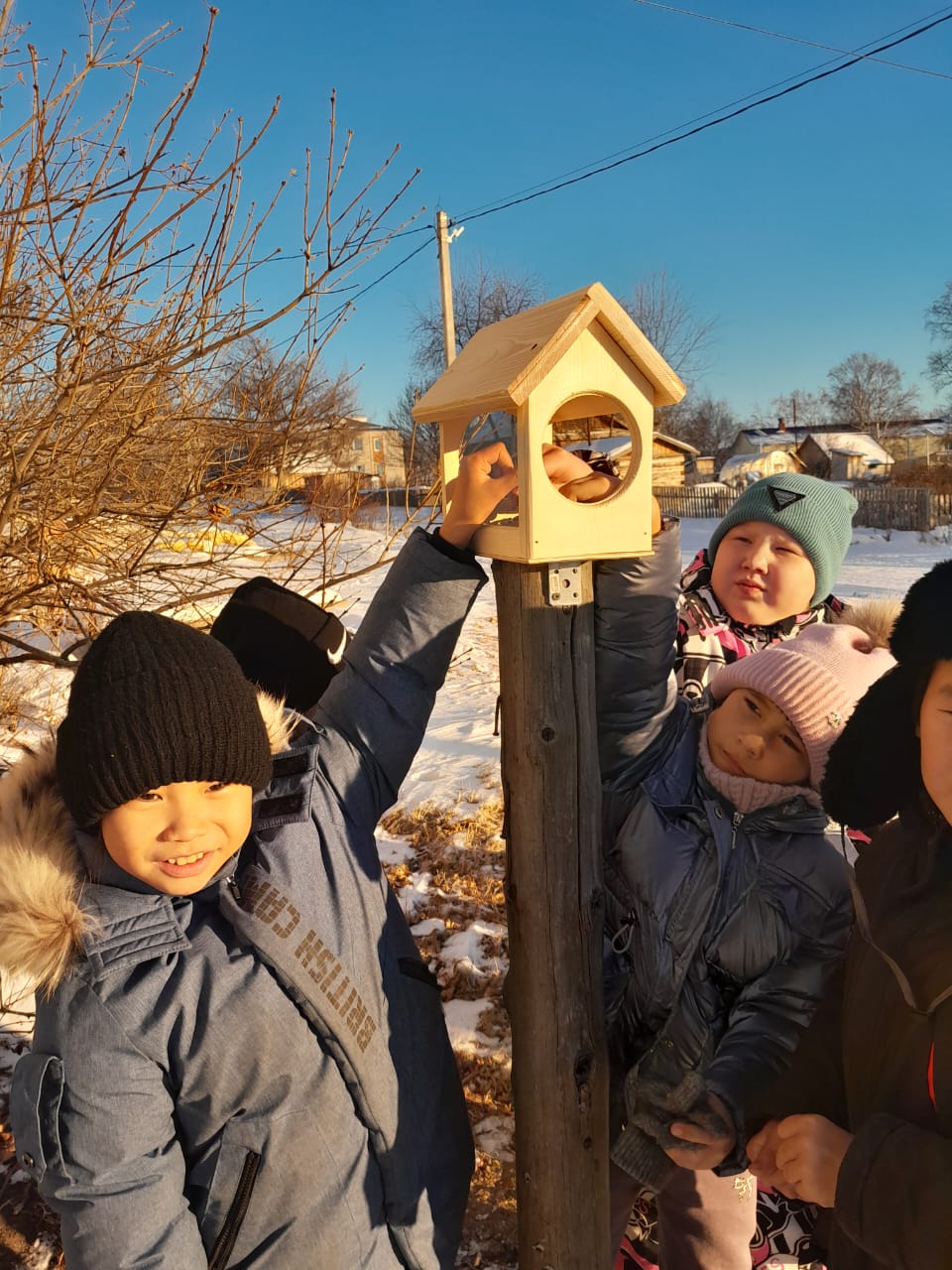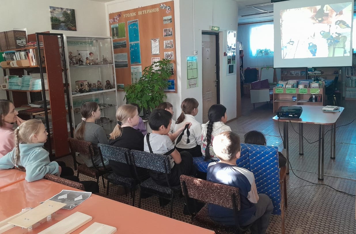Для поддержки зимующих птиц тут же была изготовлена кормушка и установлена возле здания библиотеки, а дети наполнили ее овсом и семечками. На следующий день поползни, синички, воробьи прилетели к кормушке лакомиться оставленным для них угощением.