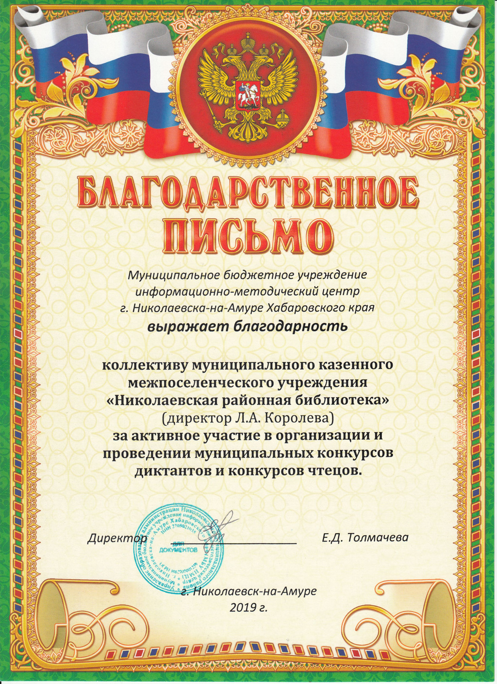 Rodina site contest II place Gratitude travel on Amur  Blagodarnost vremya udivlyatGratitude Lihanov Blagodarnost chetki kadr antinar video  Благодарность от ИМЦ  Dicrant sertificate MKMU NRB 2024 Этнографический диктант2024 Акция Знание. Театр Географический диктант 2023 Litdictant 2023 gratitude MKMU NRB             Диплом Лучшая библиотека Хабаровского Края 2020