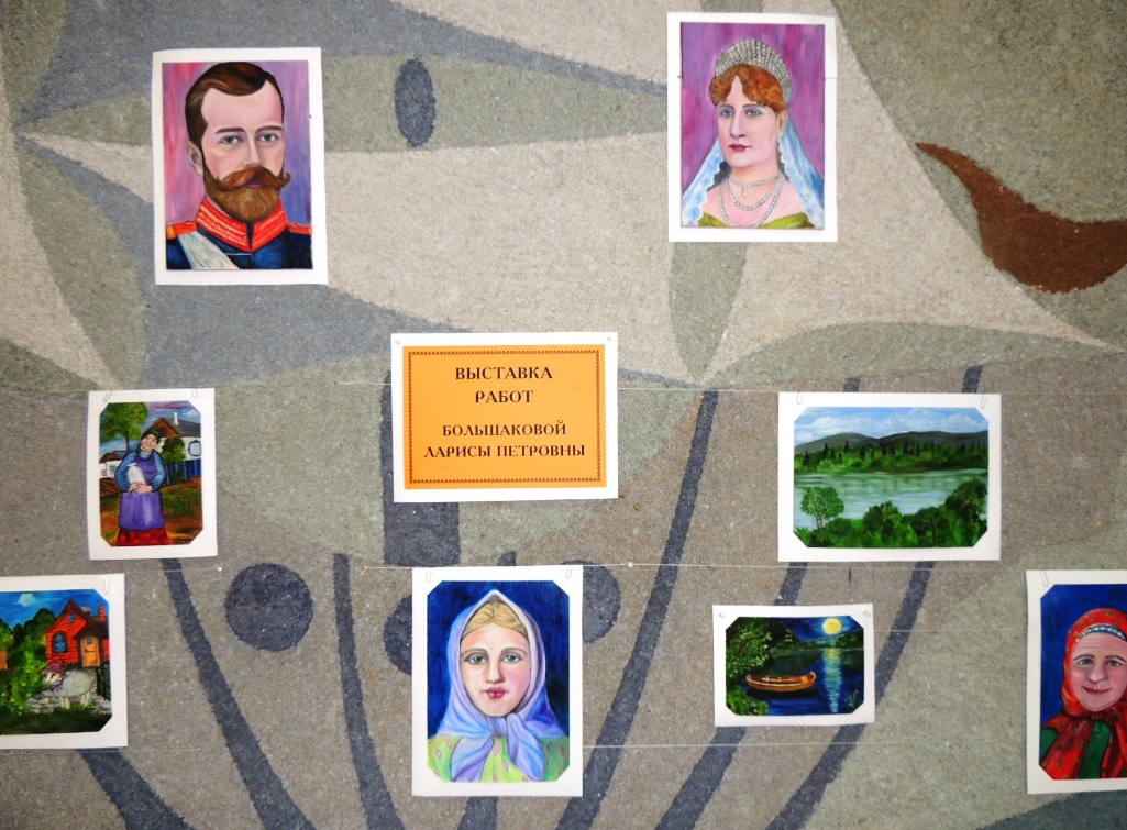 Впервые к Свято-Никольским чтениям в конференц-зале Николаевской районной библиотеки была оформлена выставка работ матушки Ларисы. Самобытные картины (пейзажи, портреты, жанровые зарисовки) жительницы г. Николаевска-на-Амуре Ларисы Петровны Большаковой, привлекают своей живостью, добротой, чистыми красками и внутренним светом.