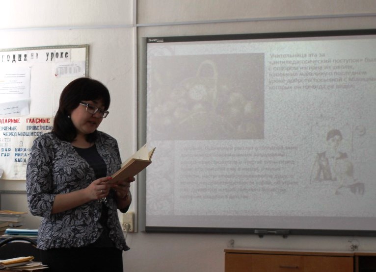 Заведующая библиотекой Кини Т.В., при помощи электронной презентации, познакомила учеников с произведениями Валентина Григорьевича Распутина. Ребята активно участвовали в обсуждении рассказа «Уроки французского». Посмотрели отрывок экранизации рассказа.