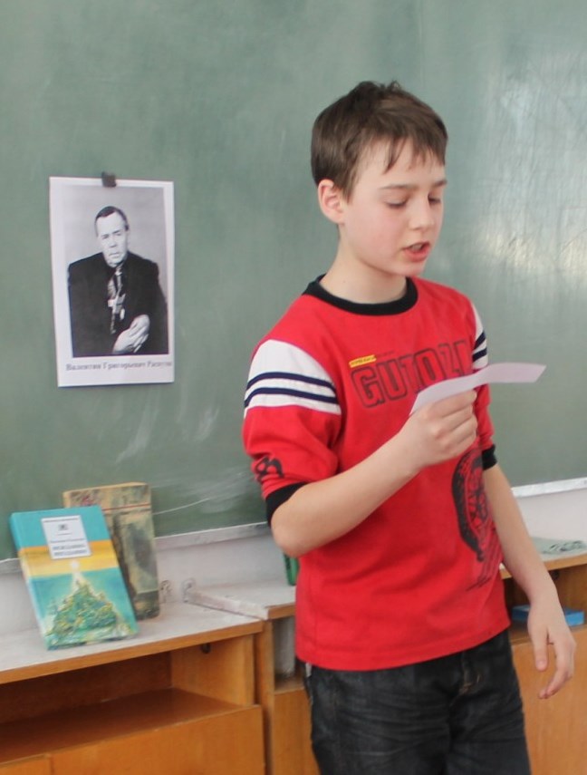 Ребята познакомились с биографией писателя. Воспоминания самого писателя нашли отклик в душах юных читателей: “Детство мое пришлось на войну и голодные послевоенные годы. Оно было нелегким, но оно, как я теперь понимаю, было счастливым. Едва научившись ходить, мы ковыляли к реке и забрасывали в нее удочки, еще не окрепнув, тянулись в тайгу, начинавшуюся сразу за деревней, собирали ягоды, грибы, с малых лет садились в лодку и самостоятельно брались за весла, чтобы грести к островам, где косили сено, потом снова шли в лес – большинство наших радостей и наших занятий было связано с рекой и тайгой. Это была она, известная всему свету река, о которой слагались легенды и песни”.