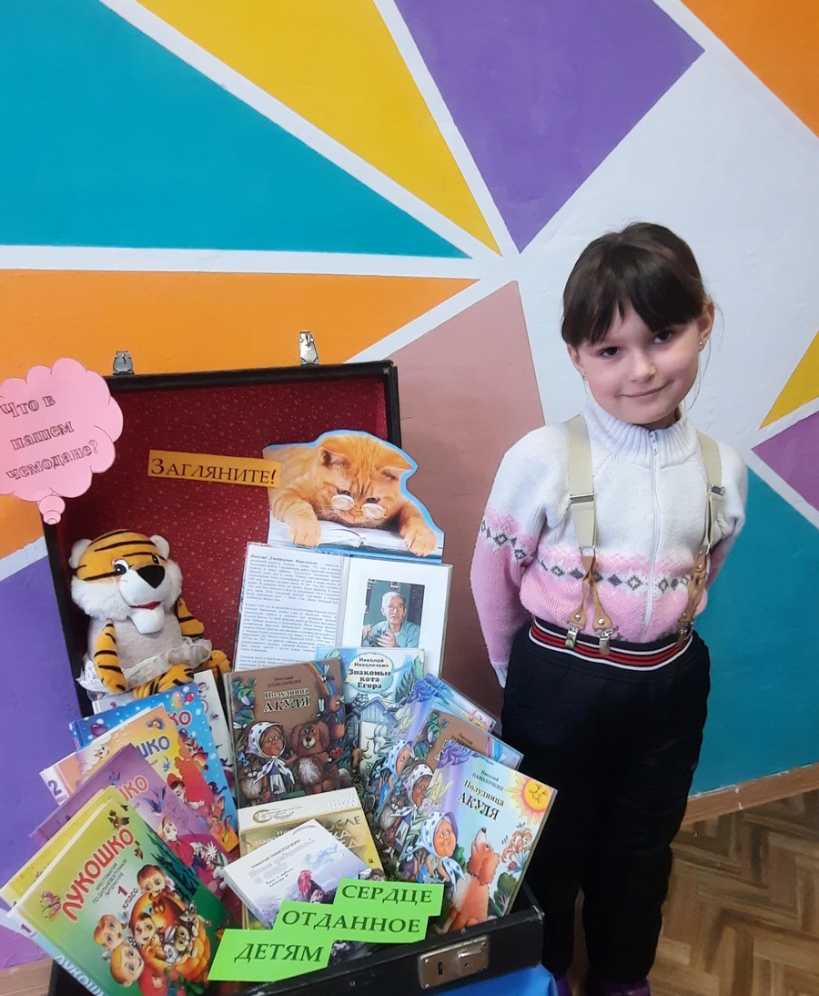 Выставка-инсталляция «Что в нашем чемодане? Загляните!» поместились книги известного дальневосточного писателя Николая Дмитриевича Наволочкина. Забавные истории о коте Егоре и Полуднице Акуле ждут вас в гости! Удивительно весёлые, добрые и увлекательные повести Н.Д. Наволочкина с первой страницы покорят своим обаянием и станут одними из любимых произведений детства. (А.А. Морозова, зав. Константиновской библиотекой)