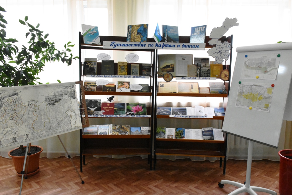 На абонементе Районной библиотеки оформлена тематическая выставка «Путешествие по книгам и картам», где представлена литература по географии Хабаровского края и города Николаевска-на-Амуре.